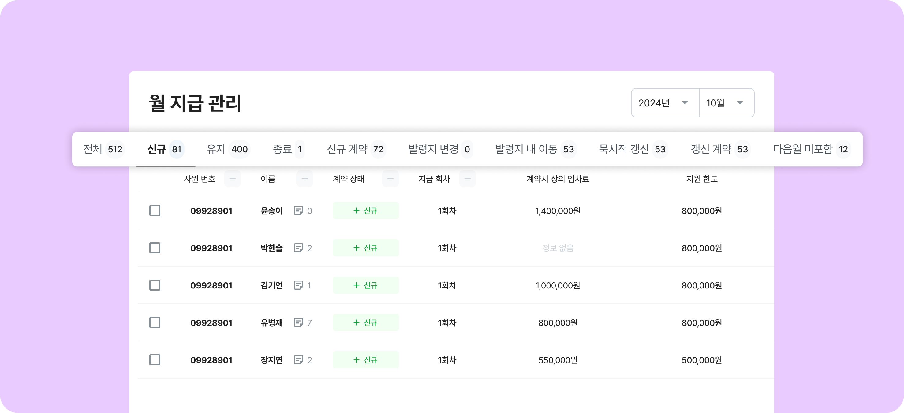 월 지급 관리 메뉴에 필터 기능이 추가되어, 특정 조건에 맞는 지급 내역을 쉽게 찾아볼 수 있게 되었습니다.
