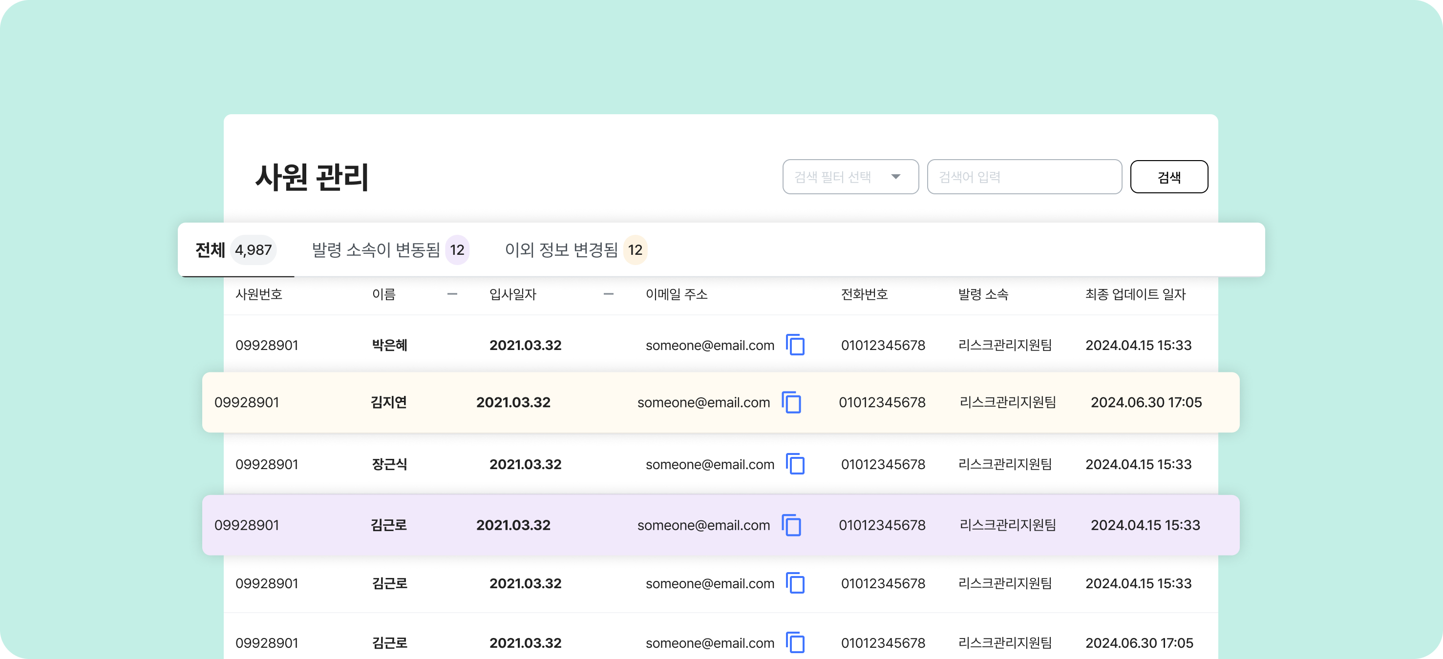 직원 관리 메뉴에서 발령 정보나 기타 정보가 변경된 직원은 하이라이트된 색상으로 표시되어 쉽게 구분할 수 있습니다.