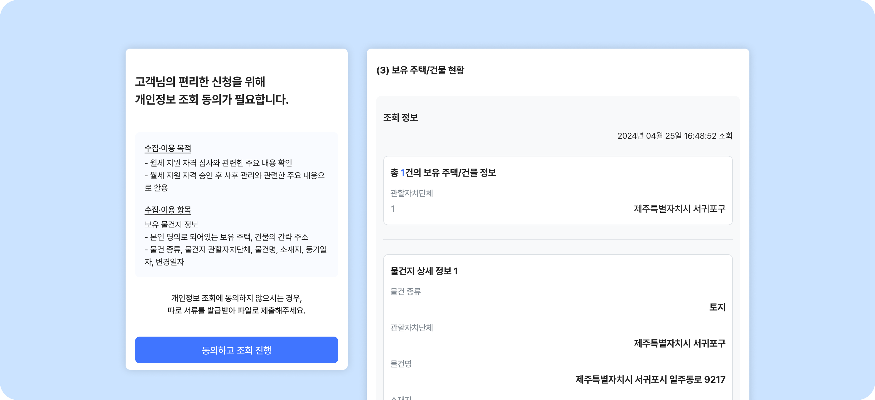 워크드에서 자체 개발한 위택스 API를 통해 근로자는 보유 물건지 정보를 간편하게 조회할 수 있습니다.