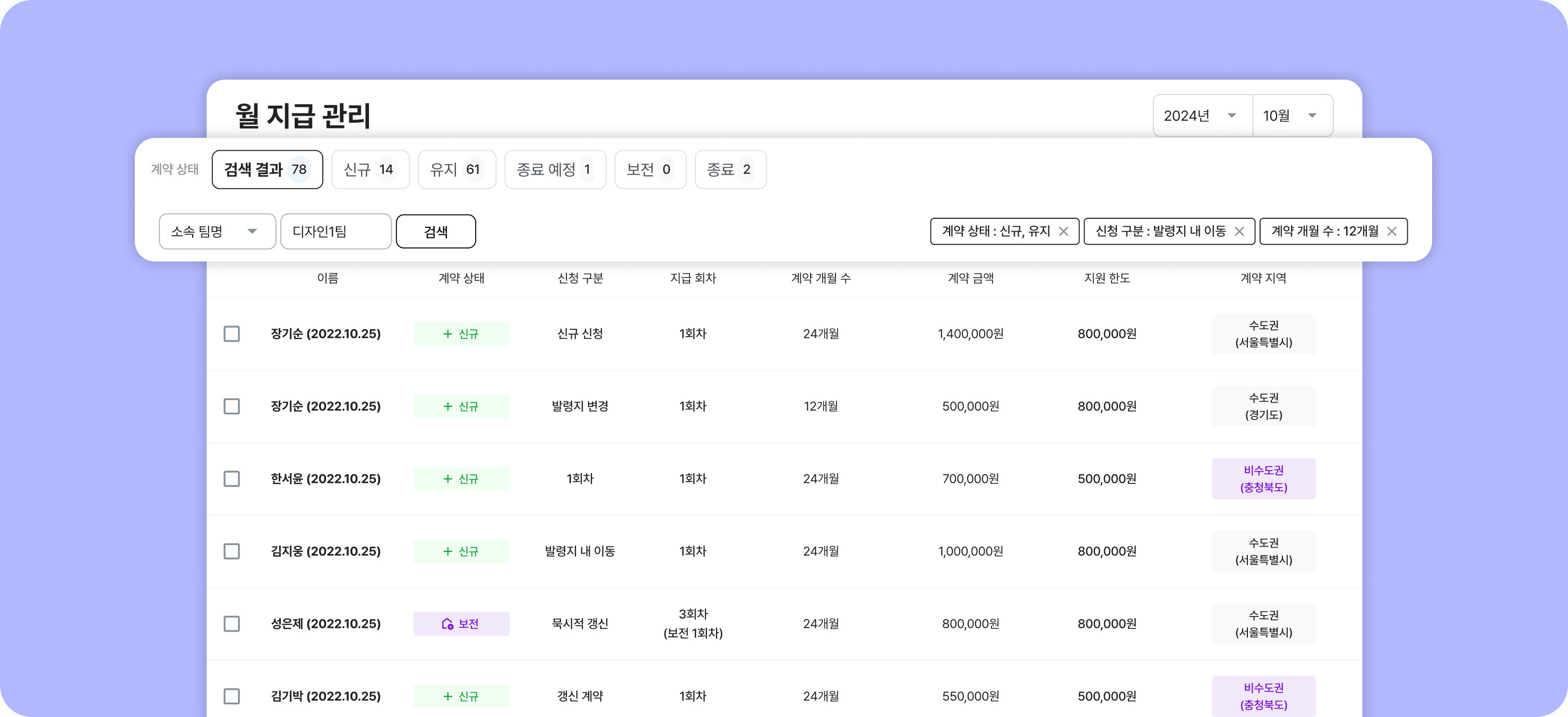 월 지급 관리, 지원 신청 내역(구 통합 신청 내역), 서류 제출 현황 메뉴에 새로운 탭 필터 UI가 적용되었습니다.