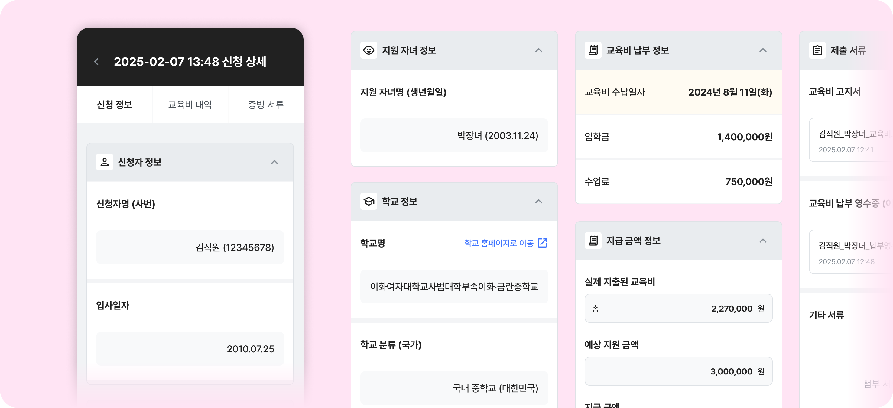 이번 업데이트에서는 학비 지원금 신청 과정에 여러 편의 기능을 추가하여 사용자의 편리함을 더욱 강화했습니다.