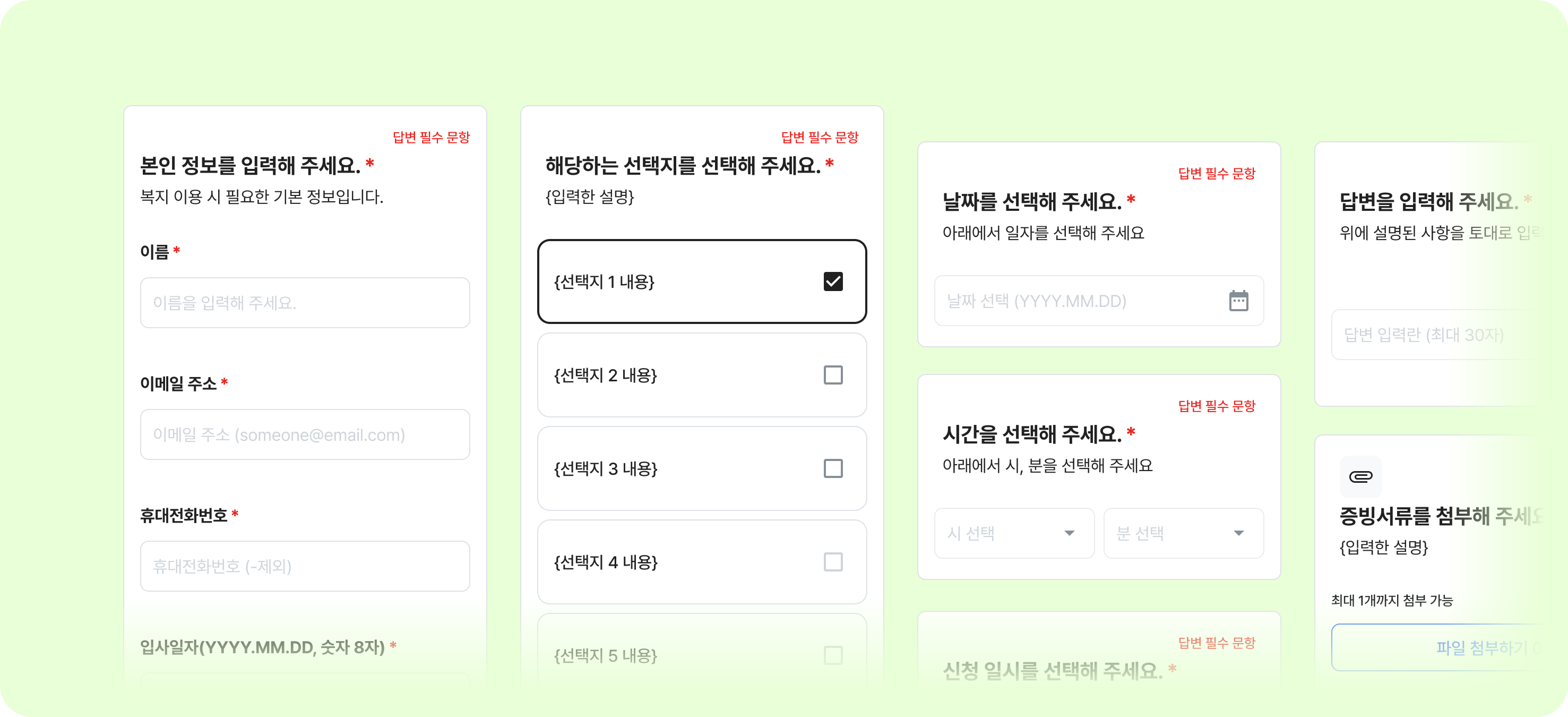 이 빌더를 통해 관리자는 아래 6가지 모듈을 자유롭게 조합하여 원하는 형태의 신청 폼을 만들 수 있습니다.