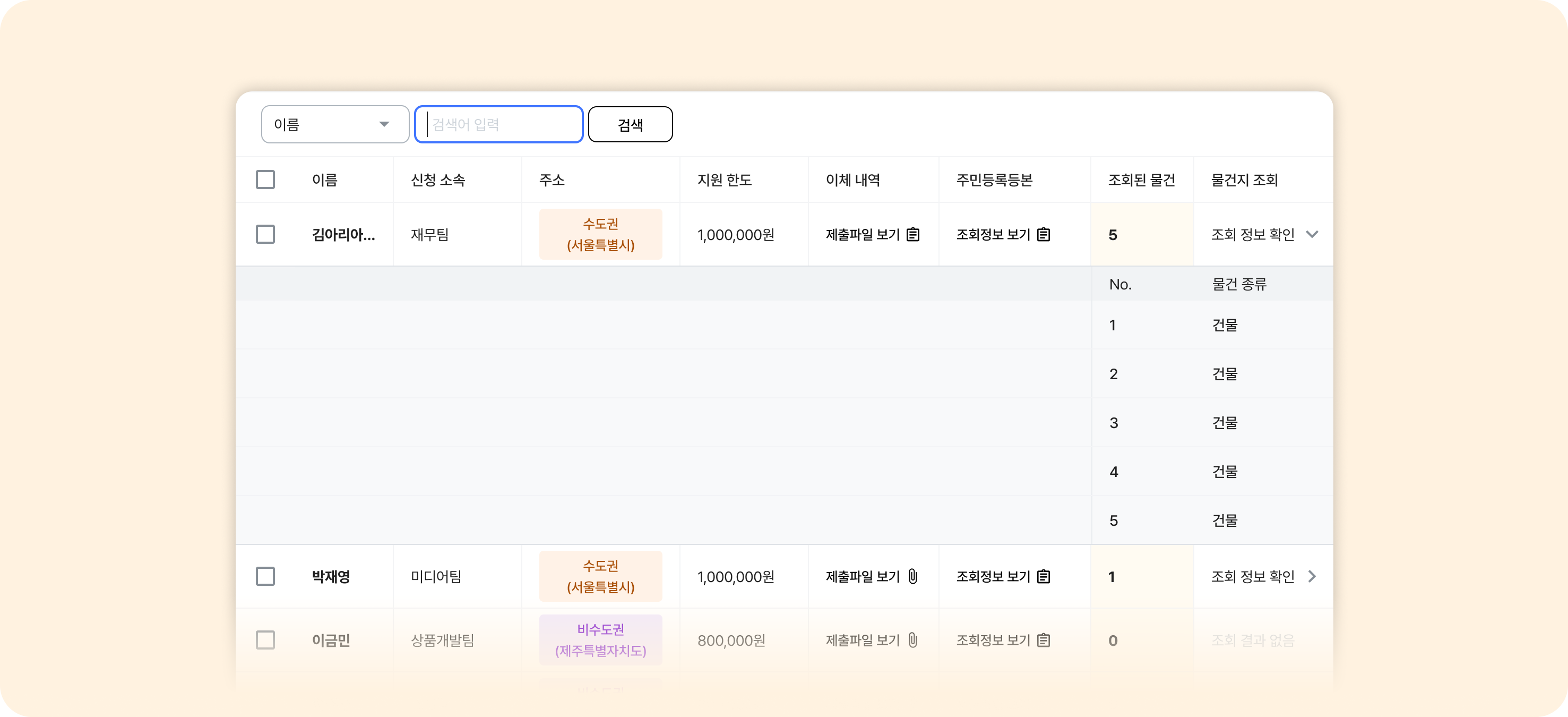 관리자는 정기 증빙 내역 페이지에서 사원번호나 이름을 기준으로 특정 근로자의 정기 증빙 제출 내역을 쉽게 조회할 수 있습니다.