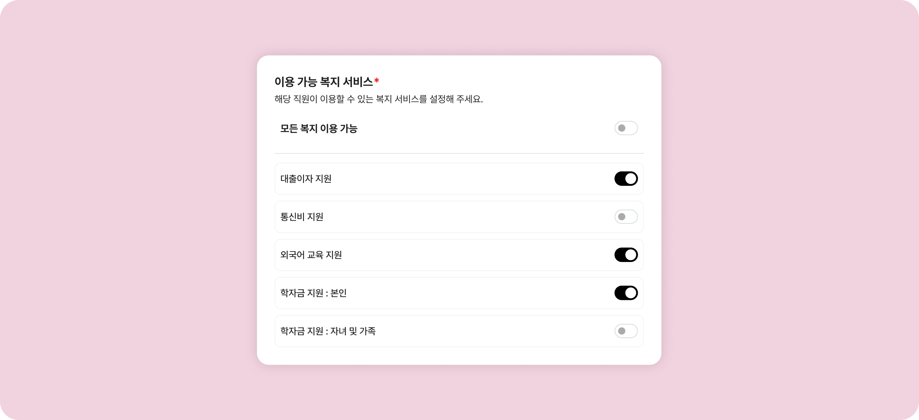 이제 회사 정책이나 개인별 자격 조건에 따라 맞춤형으로 신청 가능 복지를 제한하거나 열어둘 수 있어, 보다 정교한 복지 운영이 가능합니다.
