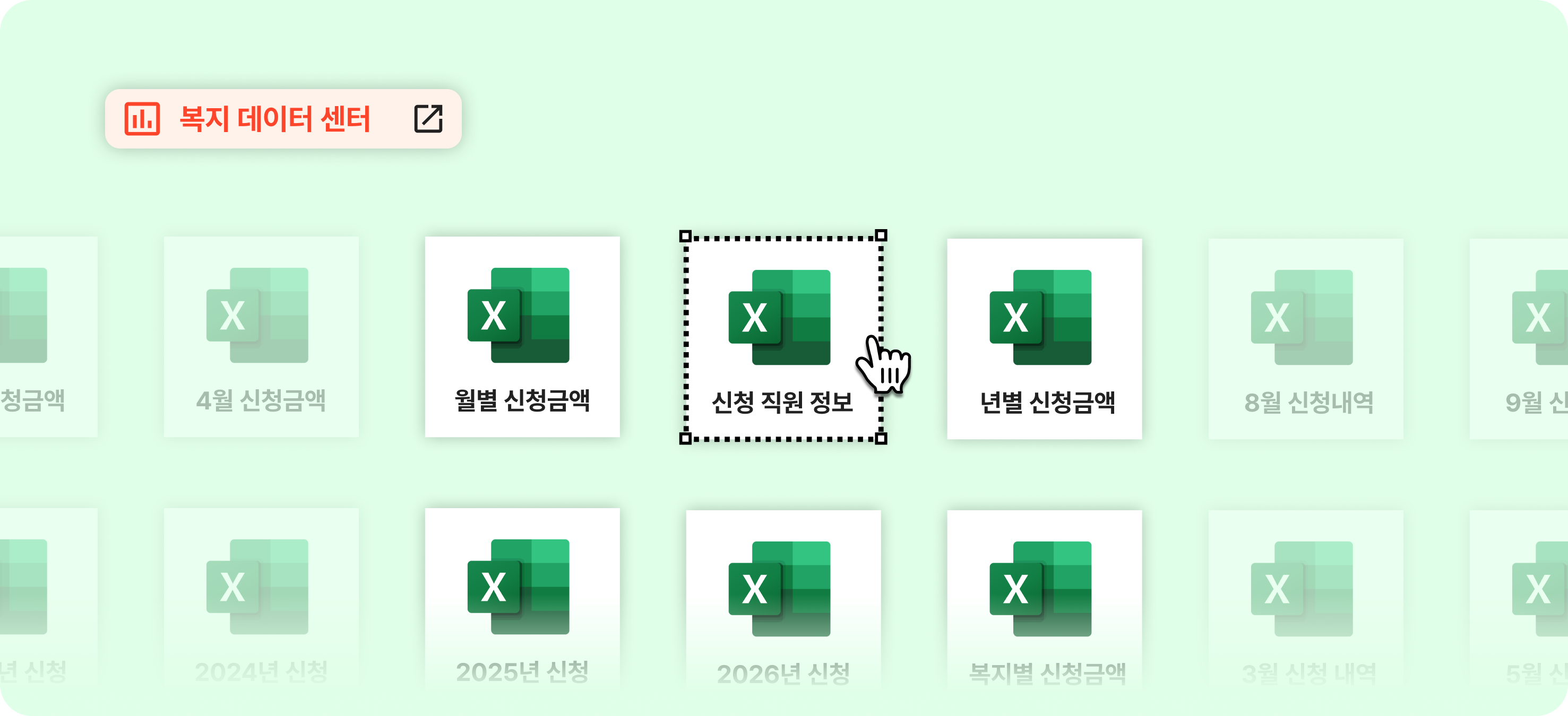 관리자는 직원별·복지별 지급 금액을 신청 연도별로 엑셀 파일로 다운로드할 수 있는 복지 데이터 센터 메뉴를 사용할 수 있습니다.