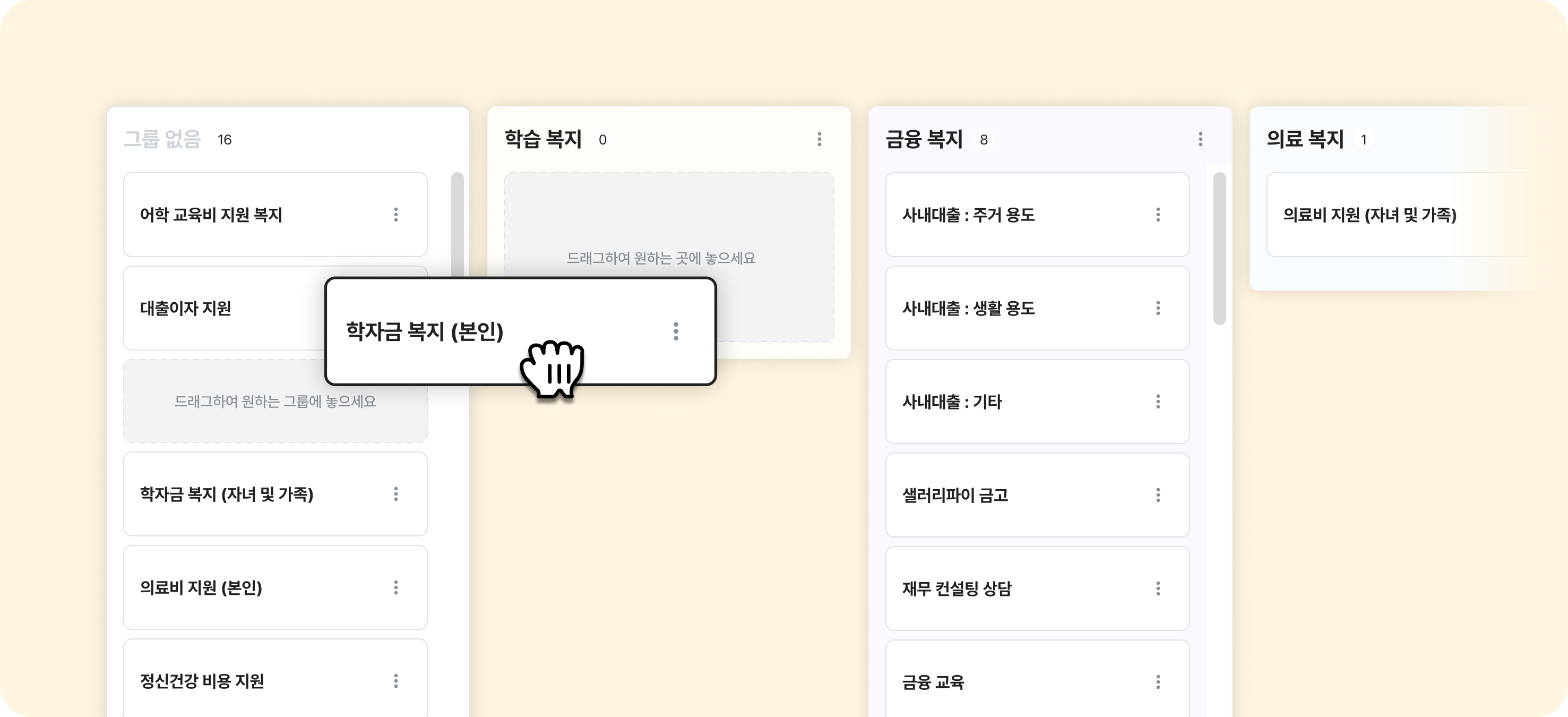 관리자는 복지 리스트 페이지에서 칸반보드 뷰를 활용해 복지를 그룹화할 수 있고, 근로자는 신청 시 대분류(그룹) → 중분류(복지 항목) 순으로 선택해 신청할 수 있습니다.