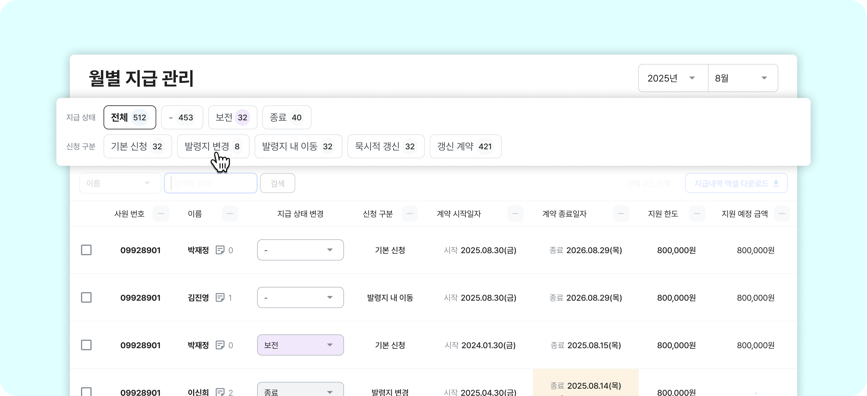 2. 월세 지원의 지급관리 페이지가 개선되었습니다.