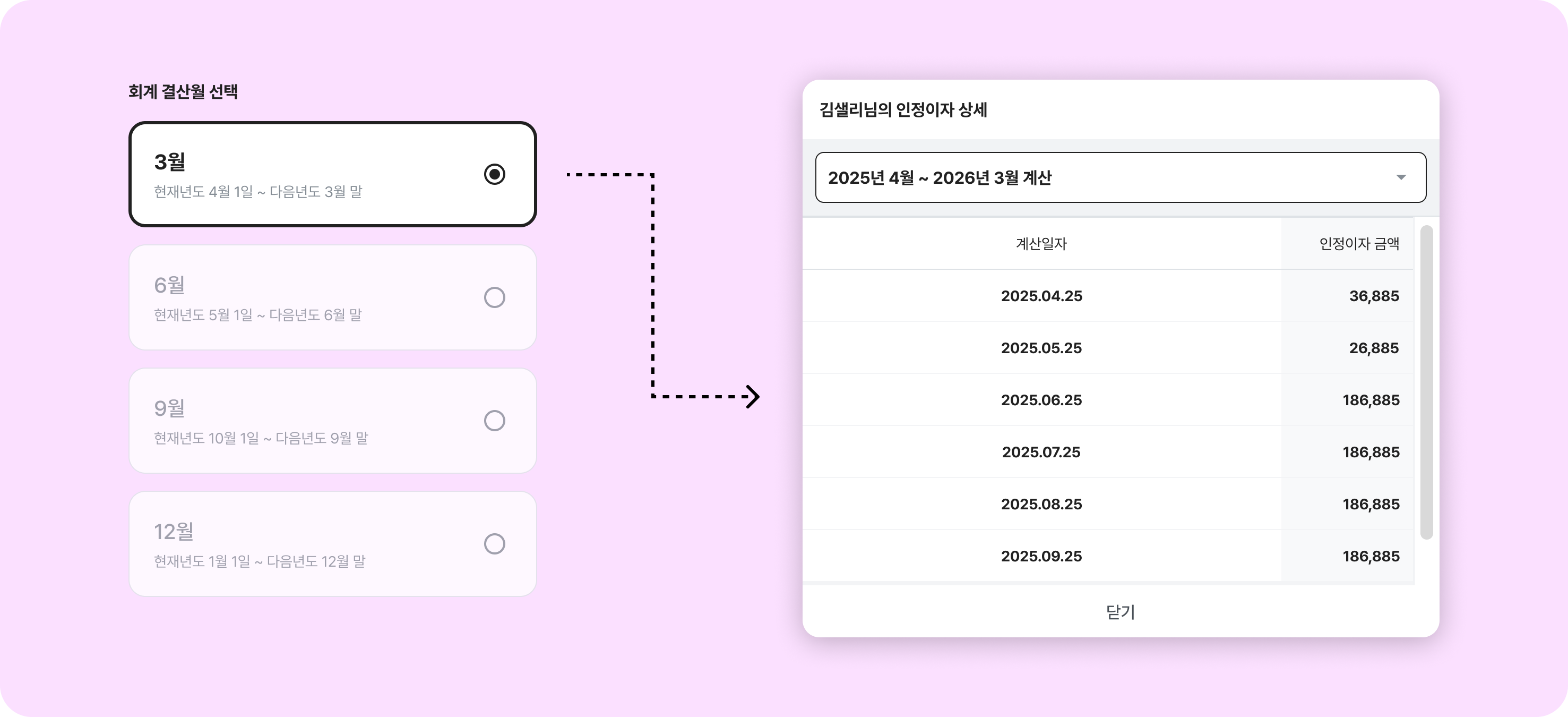 이제 일부 기업에서 사용하는 3·6·9·12월 등 별도 회계 결산월 기준으로도 인정이자를 계산할 수 있는 전용 페이지가 추가되었습니다.