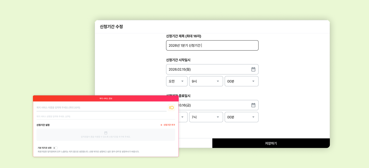 복지의 신청 가능 기간에 대해 제목, 시작 일시, 종료 일시를 지정할 수 있습니다.