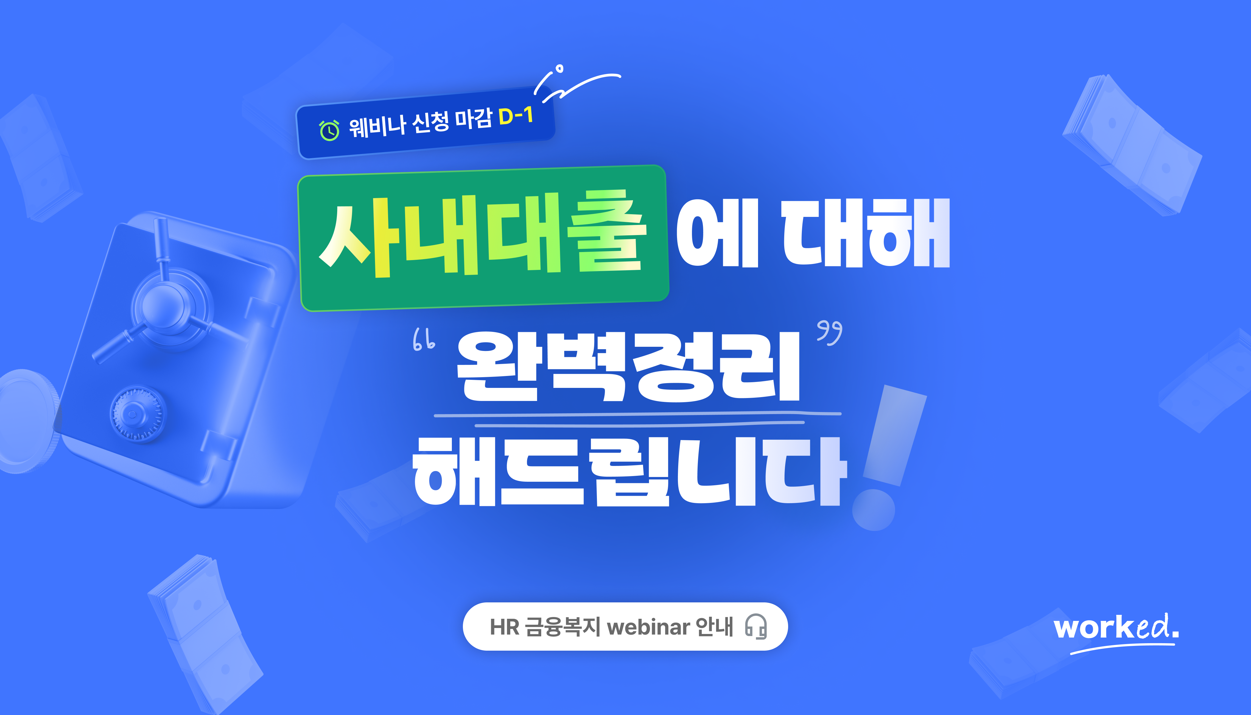 이번 워크드 웨비나에서 사내 대출 복지에 대해 30분 동안 완벽 정리해드립니다. 사내 대출 복지에 대해 고민중이시라면 꼭 신청해 주세요!