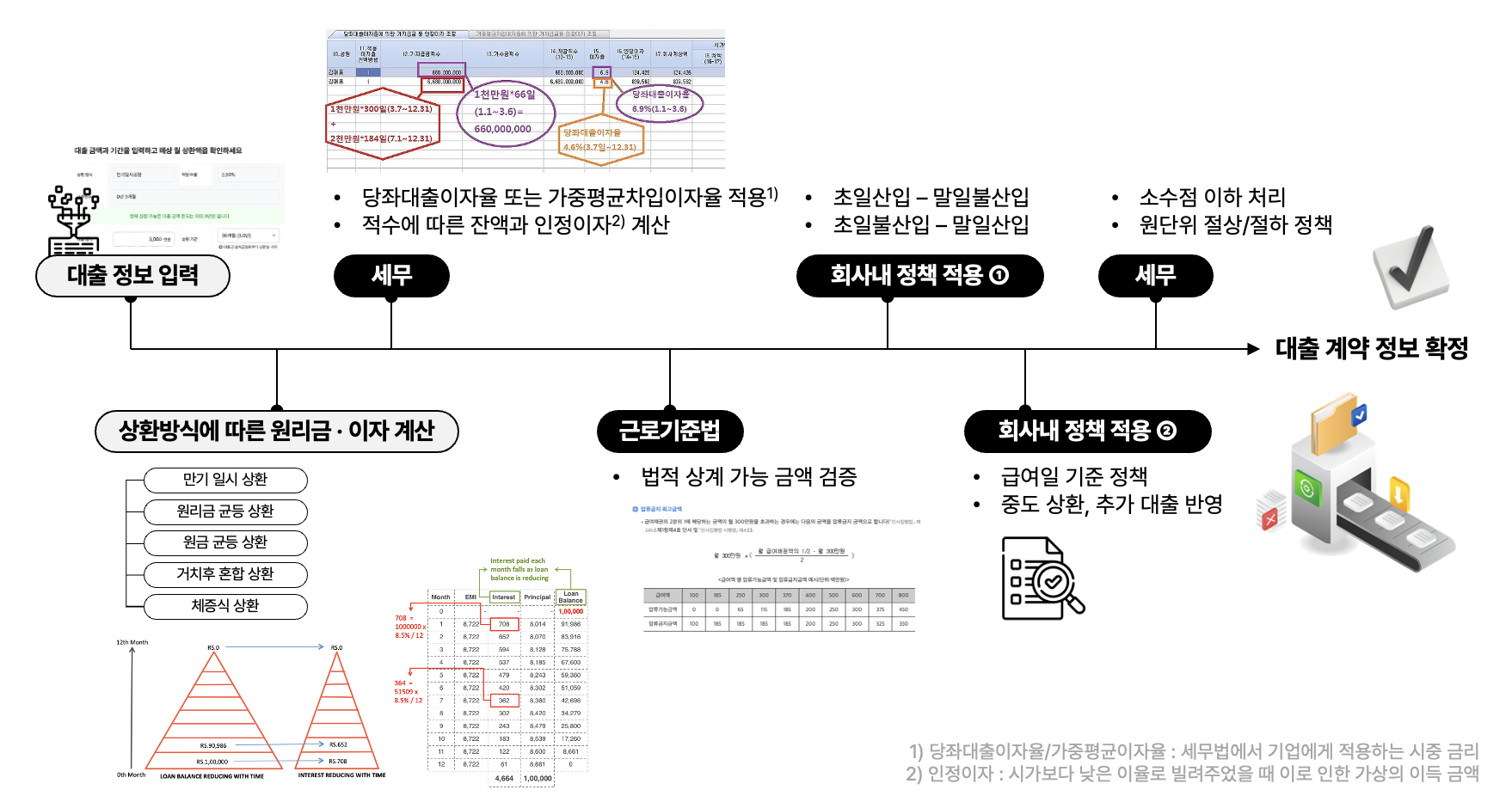 사내 대출은 계산식의 적용 시점과 추후 적용 하는 인자들이 달라지기에, 인터넷이나 시중은행 홈페이지에 나온 [금융계산기],[대출계산기]로 나온 값을 상환 플랜으로 하실 경우, 추후 근로자로부터 원리금을 더 수취하거나 반납 받아야할 수 있습니다. 또한 회사마다 세무/회계의 방향성이 다르므로 같은 금액과 이율로 빌려주어도 회사마다 상환액이 다를 수 있습니다.